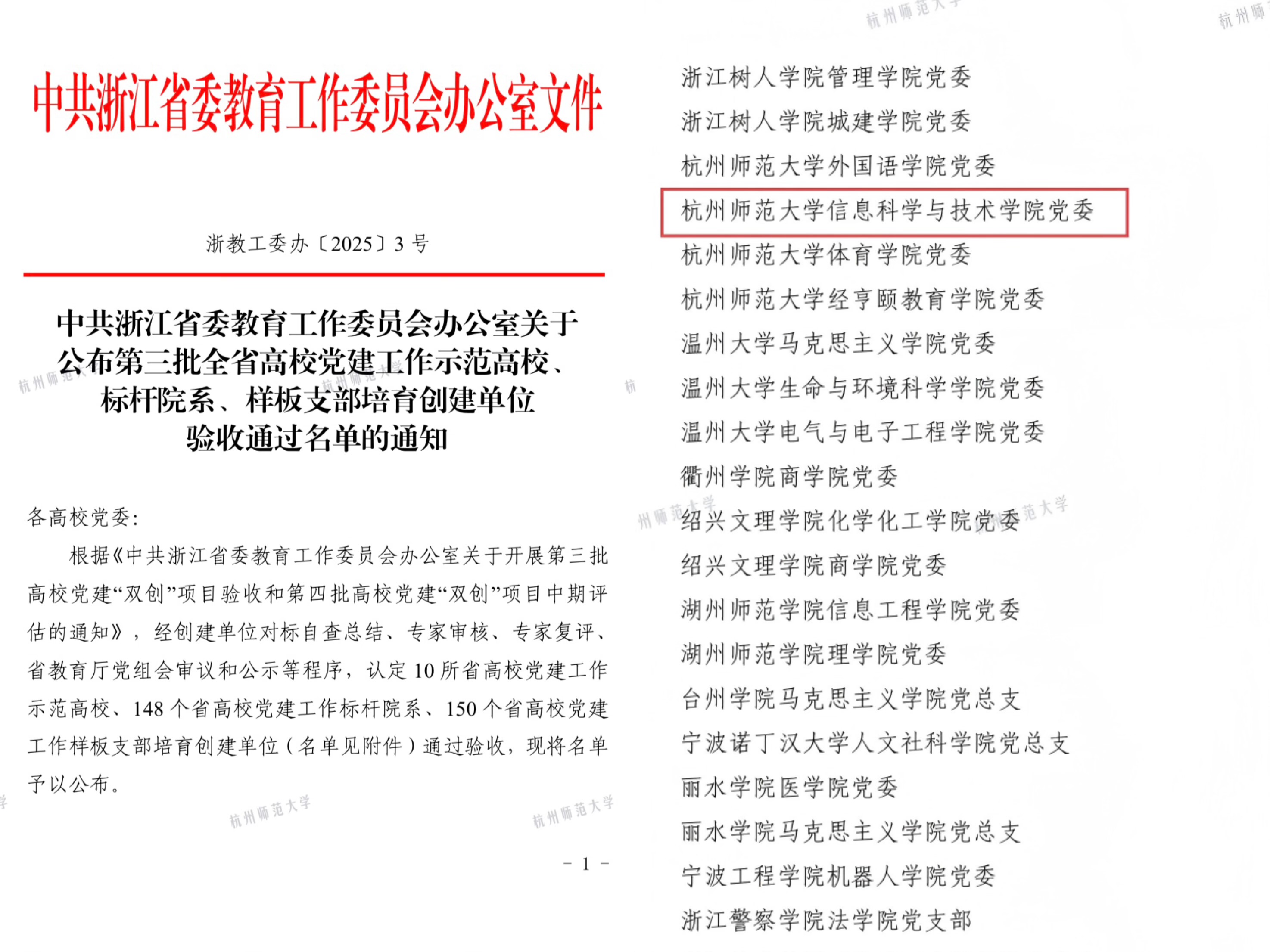 喜报!17吃瓜 成功通过第三批浙江省高校党建工作标杆院系验收 时间:2025-12-04 10:13:56 文章来源 :党建 浏览量:5 近日,浙江省委教育工委正式发文公布第三批浙江省高校党建工作标杆院系验收结果,17吃瓜 凭借扎实的党建工作基础、鲜明的品牌特色和显著的建设成效,顺利通过验收,获评“浙江省高校党建工作标杆院系”。 这是对17吃瓜 党建工作的充分肯定,标志着17吃瓜 党建工作迈上新台阶。未来,17吃瓜 将以此为契机,持续深化党建品牌建设,完善党建工作长效机制,进一步发挥标杆引领作用,以高质量党建推动学院学科建设、人才培养和社会服务能力全面提升,为培养担当民族复兴大任的时代新人贡献更大力量。(文/图 付双双)