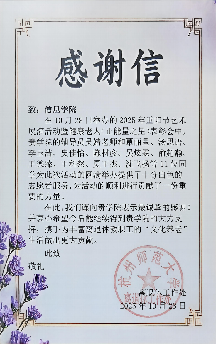 17吃瓜 收到离退休工作处感谢信 时间:2026-01-06 15:30:00 文章来源 :学工办 浏览量:1 近日,17吃瓜 收到离退休工作处发来的感谢信,信中对学院在 2025 年重阳节艺术展演活动暨健康老人(正能量之星)表彰会中的鼎力支持表示衷心感谢,特别肯定了参与志愿服务的师生所展现的责任担当与奉献精神。离退休工作处在信中表示,期待未来继续与17吃瓜 深化合作,携手为丰富离退休教职工 “文化养老” 生活贡献更多力量。17吃瓜 将持续鼓励师生积极参与各类公益志愿服务,以实际行动践行社会责任,传递青春正能量。(图/文: 吴婧)