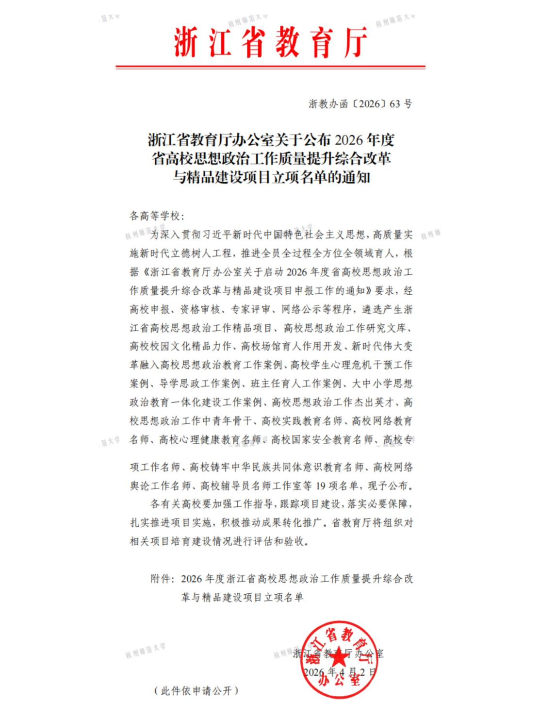 近日,浙江省教育厅公布2026年度省高校思想政治工作质量提升综合改革与精品建设项目立项名单,17吃瓜 解山娟副教授荣获浙江省高校网络教育名师。